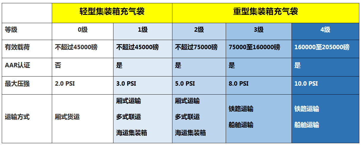 下边的数据图表详细描述了集装箱打气级级别、有效载荷、较大 气体压强与适应的运输方式。